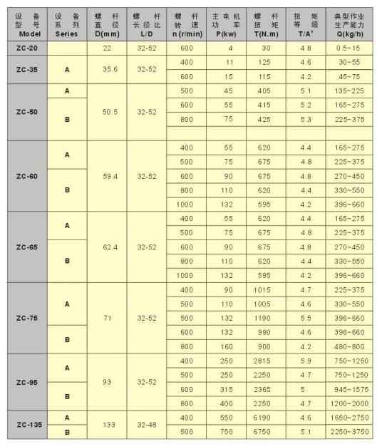 ZC-A、B系列雙螺桿機(jī)型參數(shù)表