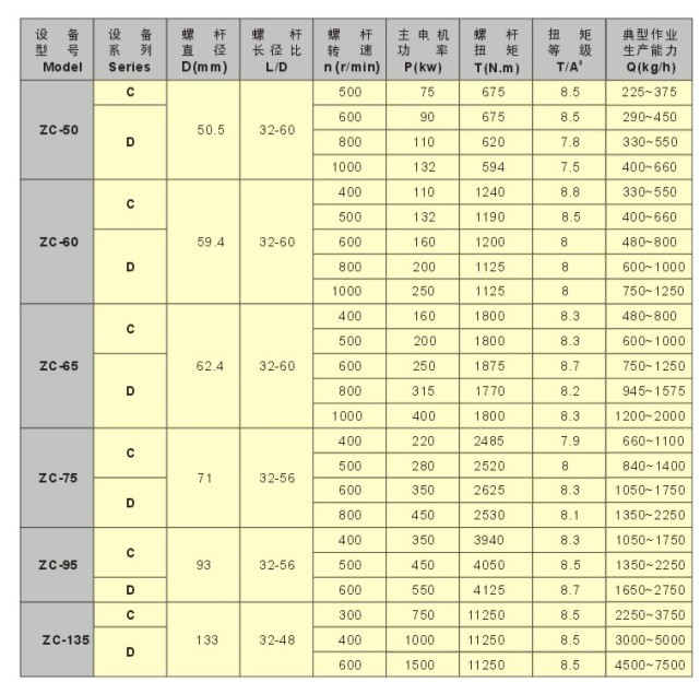 ZC-C、D系列雙螺桿擠出機(jī)組主要技術(shù)參數(shù)